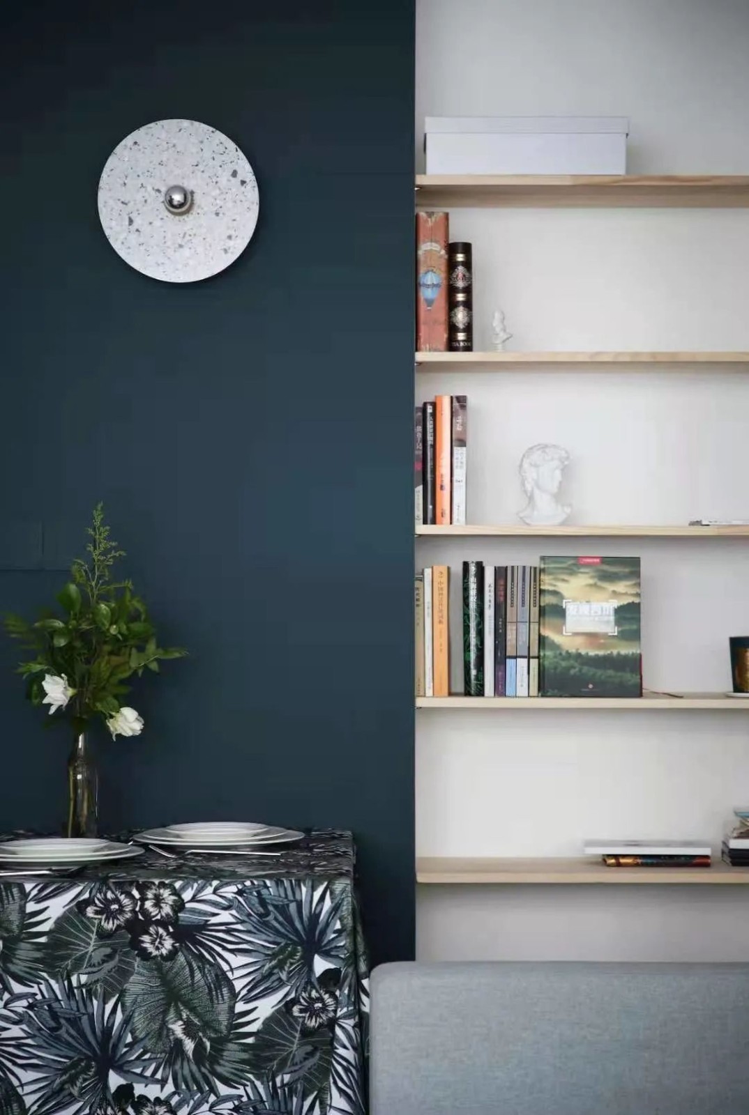 沙發(fā)墻后略顯空蕩,因?yàn)閷?duì)面陳列柜上已經(jīng)有大幅掛畫,屋主別出心裁將一本詩(shī)集拆開,一頁(yè)一頁(yè)鋪貼開作為背景,配合綠色的膠帶,整齊劃一,又頗具個(gè)性,強(qiáng)迫癥患者表示非常舒適。
